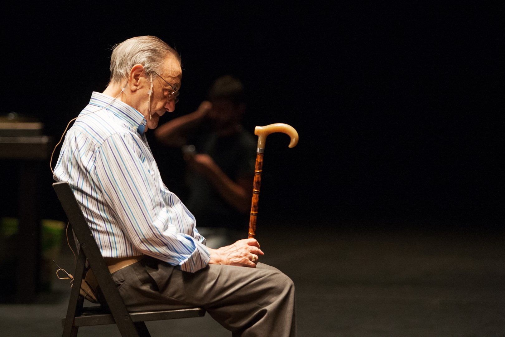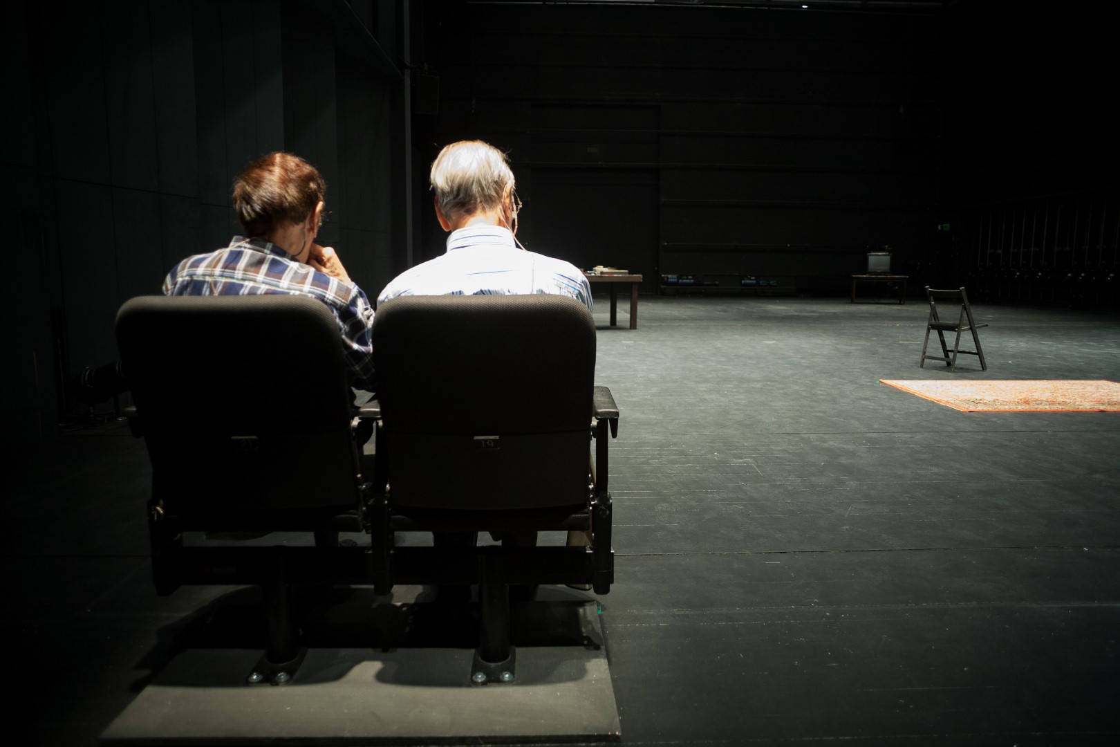 La Orquestina de Pigmeos es un colectivo formado por Nilo Gallego y Chus Domínguez, dos leoneses que provienen de disciplinas supuestamente muy diferentes (la música, el arte sonoro, y el cine), pero que se encuentran en un territorio común, la performance, el arte de acción, habría que añadir muchos más nombres más para intentar definir ese territorio con más propiedad. Pero, ¿para qué intentar definir con palabras algo que, cuando lo experimentamos un par de veces, reconocemos ya para siempre? La Orquestina de Pigmeos lleva años montando experiencias maravillosas que perduran en el recuerdo de quienes las vivieron. Experiencias que suceden en el curso de un río, encima de un volcán mientras sale el sol, en una playa mientras sube la marea o en una ría vista desde el interior de una fábrica de tornillos, por poner algunos ejemplos que permitan situarnos. Son experiencias, como la de hoy, que sólo suceden una vez, o dos como mucho, como en esta ocasión. No se repiten jamás porque no es esa su vocación, al contrario de lo que sucede con una producción del CDN, cuyo objetivo, y éxito, es repetirse una y otra vez, todo lo que se pueda. Es arte efímero y, curiosamente, no por eso menos perdurable, al menos, en la memoria colectiva. También se caracterizaban, hasta el momento, porque no sucedían jamás en el interior de un teatro. Hasta hoy. A pesar de que los organizadores del ciclo, dados estos antecedentes, les propusieron utilizar los exteriores del edificio, a pesar de que el encargo les daba libertad para disponer del barrio de Lavapiés a su antojo, Nilo Gallego y Chus Domínguez observaron que, El lugar sin límites, a pesar de su nombre, hacía referencia a un lugar perfectamente delimitado: un escenario teatral. Por eso decidieron, por primera vez, meterse en un teatro. Dentro del teatro tenían libertad para utilizar todo el espacio a su antojo, sin limitarse a la caja escénica, pero movidos por ese afán de coherencia radical, llamémosle así, insistieron en utilizar el escenario, todo el enorme escenario del Valle-Inclán, con toda su profundidad, y con el público sentado en sus butacas. Lo que sería lo normal en cualquier otro caso, en el caso de la Orquestina de Pigmeos podríamos decir que es lo más raro que han hecho en su vida. A mí no deja de parecerme una posición extremadamente consecuente, una postura que pone de relieve tantas cosas que no vale la pena darle más vueltas (ya cada uno que se las dé en su cabecita, si le parece, si se lo sugiere y lo cree conveniente). La cosa se llama Género chico, el nombre que recibe un determinado tipo de Zarzuela, de formato breve (como lo que vamos a presenciar), caracterizado por la poca trascendencia de su contenido, típicamente una historia de amor costumbrista con algún conflicto que siempre acaba terminando bien y con moraleja final, que es una excusa para que suenen los grandes hits de aquellos tiempos. ¿Y qué pasa ahí sobre el escenario? Pues lo primero que oímos es la definición de Género chico, extraída de la Wikipedia, dicha por una voz en off con acento francés. Aparecen dos hombres de avanzada edad, Jesús Macías y Manuel Polo Báez (quien un poco más tarde declarará en escena tener más de 90 años), que entran cruzando trabajosamente un escenario casi vacío (prácticamente sólo un monitor de televisión, a lo lejos, donde vemos escenas de un documental sobre paisajes del mundo y, en la otra punta, una mesa con tres tocadiscos) y se sientan en dos sillas de espaldas al público. Al rato, aplauden, y paran. Silencio. Vuelven a aplaudir. Silencio. Y así un rato. Luego llega Javi Rosa, quien se lleva a Manuel para hacerle unas manipulaciones sobre una alfombra, unos ejercicios, que parecen realizar juntos cada semana para mantener a Manuel en forma y ayudarle a superar sus problemas con las piernas, que le ayuden a seguir caminando. Y, mientras, hablan de sus cosas. Luego, aparece Pelayo Arrizabalaga y le pide a Jesús que le acompañe a la mesa de los tocadiscos para poner discos de Zarzuela, mientras Jesús le cuenta sobre la peluquería que regentaba, donde escuchaban Zarzuela, y sobre el Género chico, sobre sus chascarrillos y sobre la clá, ese grupo de gente (Jesús entre ellos) que, a cambio de entradas baratísimas, acudían a la Zarzuela para sentarse en los asientos libres que dejaban el resto de espectadores que entraban antes que ellos, con la condición de aplaudir cuando el jefe de la clá diera la señal, con la esperanza de que su aplauso se contagiase al resto de público para asegurar el éxito de la función. Gracias a los micrófonos que llevan y a la mezcla que se realiza desde la cabina técnica, donde (otra novedad) se esconden Nilo y Chus, a quienes, por primera vez en la historia de la Orquestina de Pigmeos, no vemos en ningún momento, el foco sonoro (que no las luces, que, más allá del oscuro inicial, están infrautilizadas: en los exteriores donde trabajan normalmente, la luz es la propia de cada espacio en cada momento, la del sol o la de las farolas), nos permite escuchar a uno de los grupos en primer plano, alternativamente, aunque las dos conversaciones se mantienen en paralelo. Luego, Pelayo mezclará la música de zarzuela con otras músicas, con la ayuda de sus tres tocadiscos y Jesús y Manuel darán un último paseíllo juntos, cogidos del brazo, lentamente, al ritmo con el que Manuel camina cada día alrededor de la manzana del barrio donde vive, para volver al punto de partida. Treinta y siete minutos, coreografiados a golpe de cronómetro, tantos minutos para esta acción, tantos minutos para la siguiente, y que dentro pase lo que tenga que pasar, al estilo de como se hacen estas cosas en la Orquestina de Pigmeos, que tiene sus propias reglas, procedimientos compartidos desde hace muchos años con otros creadores que trabajan de manera similar, nada que ver, claro, con lo que suele pasar en los escenarios de la mayoría de los teat