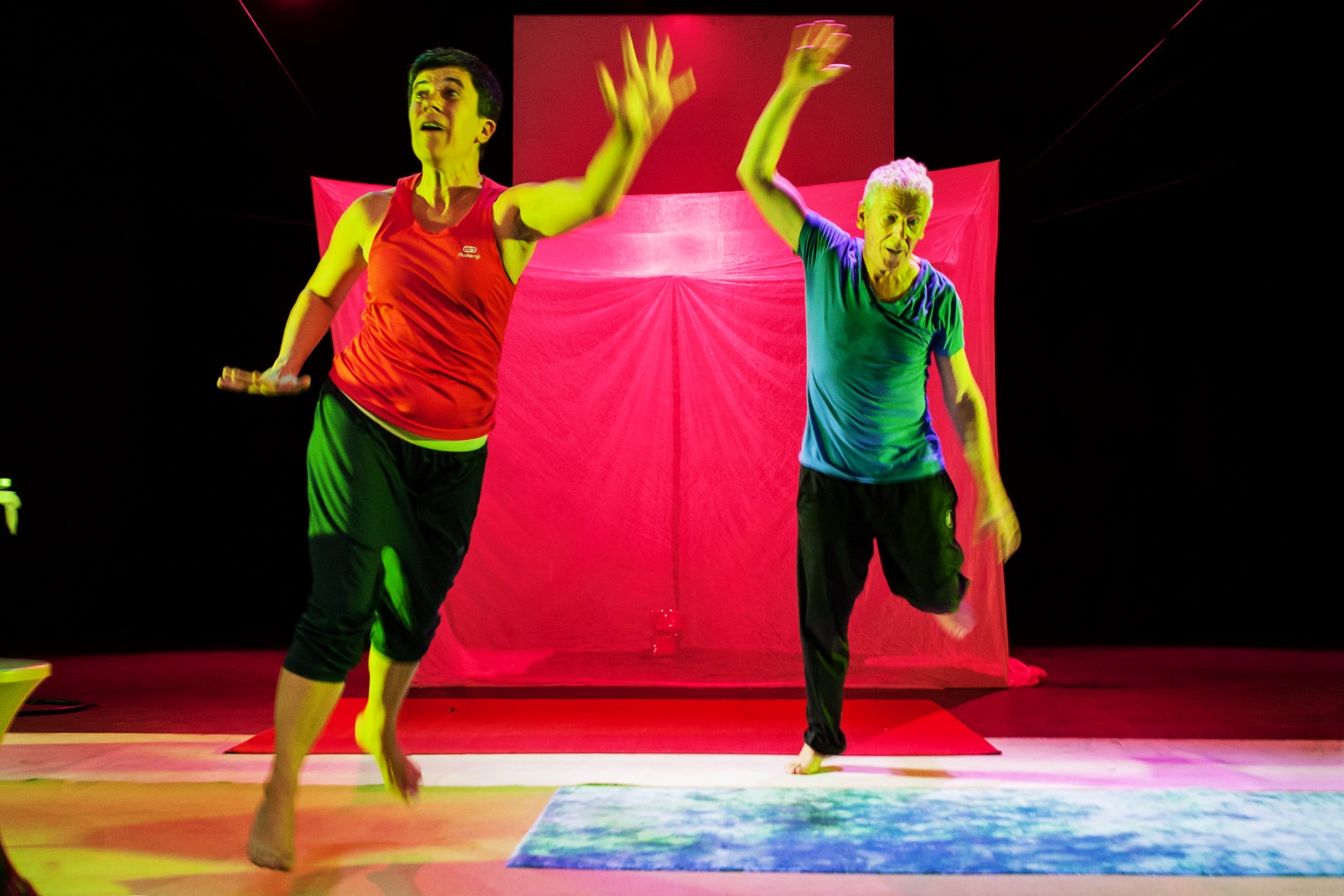En ese afán por avanzar hacia el origen la pieza contiene el relato de su propio hacerse, de las ideas y anécdotas que la han alimentado, el registro de cómo se está haciendo y deshaciendo, tratando de sostenerse en un difícil ejercicio que se hace más peliagudo a medida que avanza. Tras la impresión de cercanía, risas y espontaneidad que desprende el magnífico trabajo de los actores, la dramaturgia crece, como es característico en la poética de L´Alakran, a base de cortes inesperados, cambios de rumbo, superposiciones y un denso tejido de motivos recurrentes que multiplican los niveles de lectura. El público, al que se le da todo, pero que al mismo tiempo, quizá por eso, no se le pone fácil, se deja llevar por ideas que se cruzan, chistes y juegos para terminar enfrentado a una actividad extenuante que ocupa el centro de la segunda parte, un baile aparentemente improvisado, en un tono desenfadado, como si no fuera todo más que una broma, al ritmo de una música africana cuya coreografía tratan de seguir sin conseguirlo, y sin que les importe mucho no conseguirlo, a través de un vídeo en internet que ven en un portátil colocado sobre la mesa. El juego se repite tres veces, precedido en cada ocasión por un enfrentamiento físico entre los dos actores que van luego a bailar, y que se resuelve siempre por la senda de la paz, la reconciliación y el amor al prójimo, como si de una declaración de principios se tratara, no exenta de cierta ironía, en la que no faltan los nombres de Gandhi, Quim o el mismo Otegui. Los papeles de los actores rotan pero mantienen una misma estructura en la que se introducen variaciones. En cada ocasión uno dirige el baile, otro le acompaña, mientras el tercero cuenta micrófono en mano en un registro de feria ambulante la historia de vida del primero. Vidas comunes que no han sido fáciles, pero en las que no se pierde las ganas de luchar ni un cierto temblor de vida. El baile no es corto, se extiende en el tiempo como si fuera una prueba de resistencia para ellos y para el público, resistencia física y resistencia del entusiasmo por lo que están haciendo.